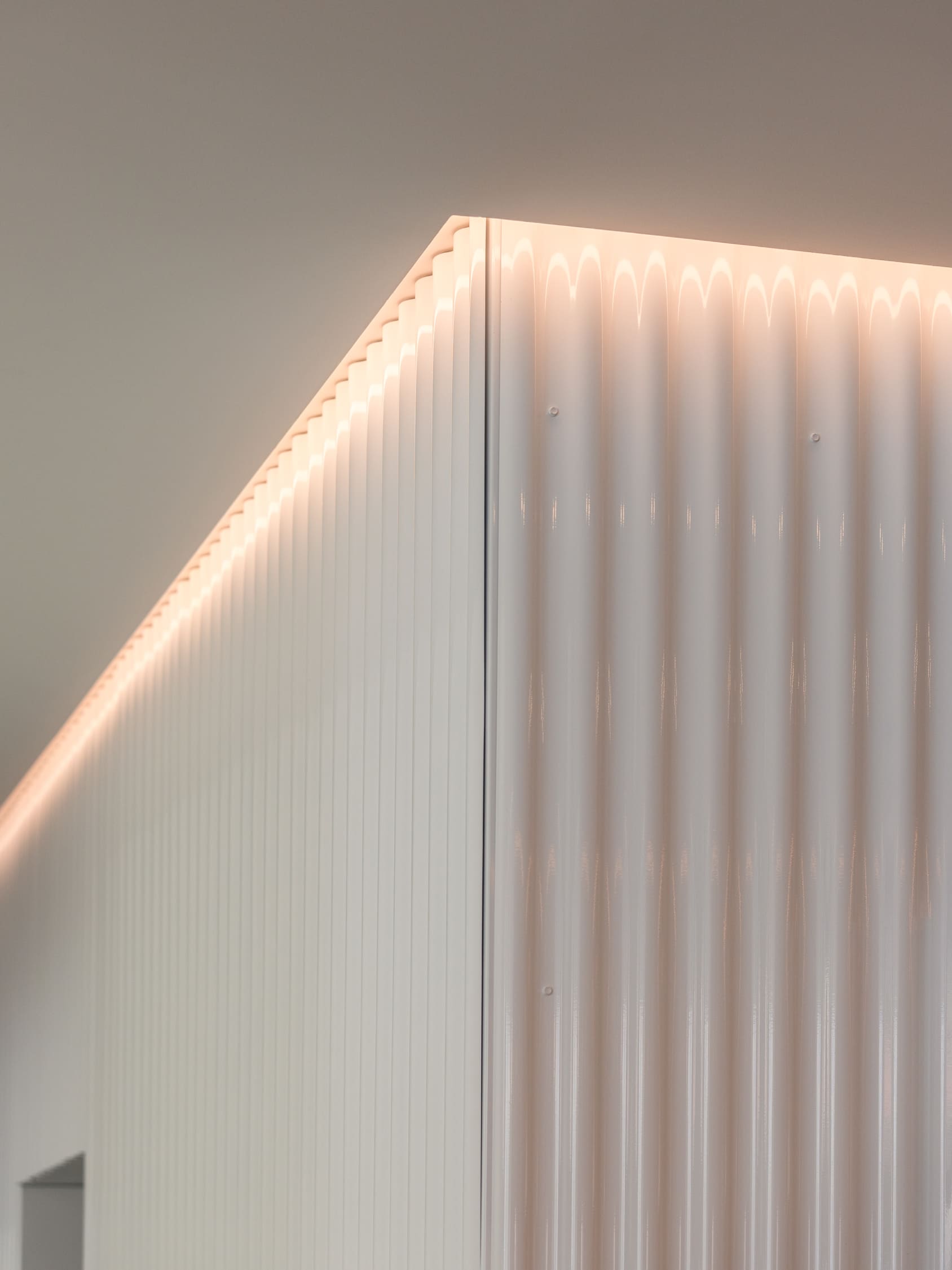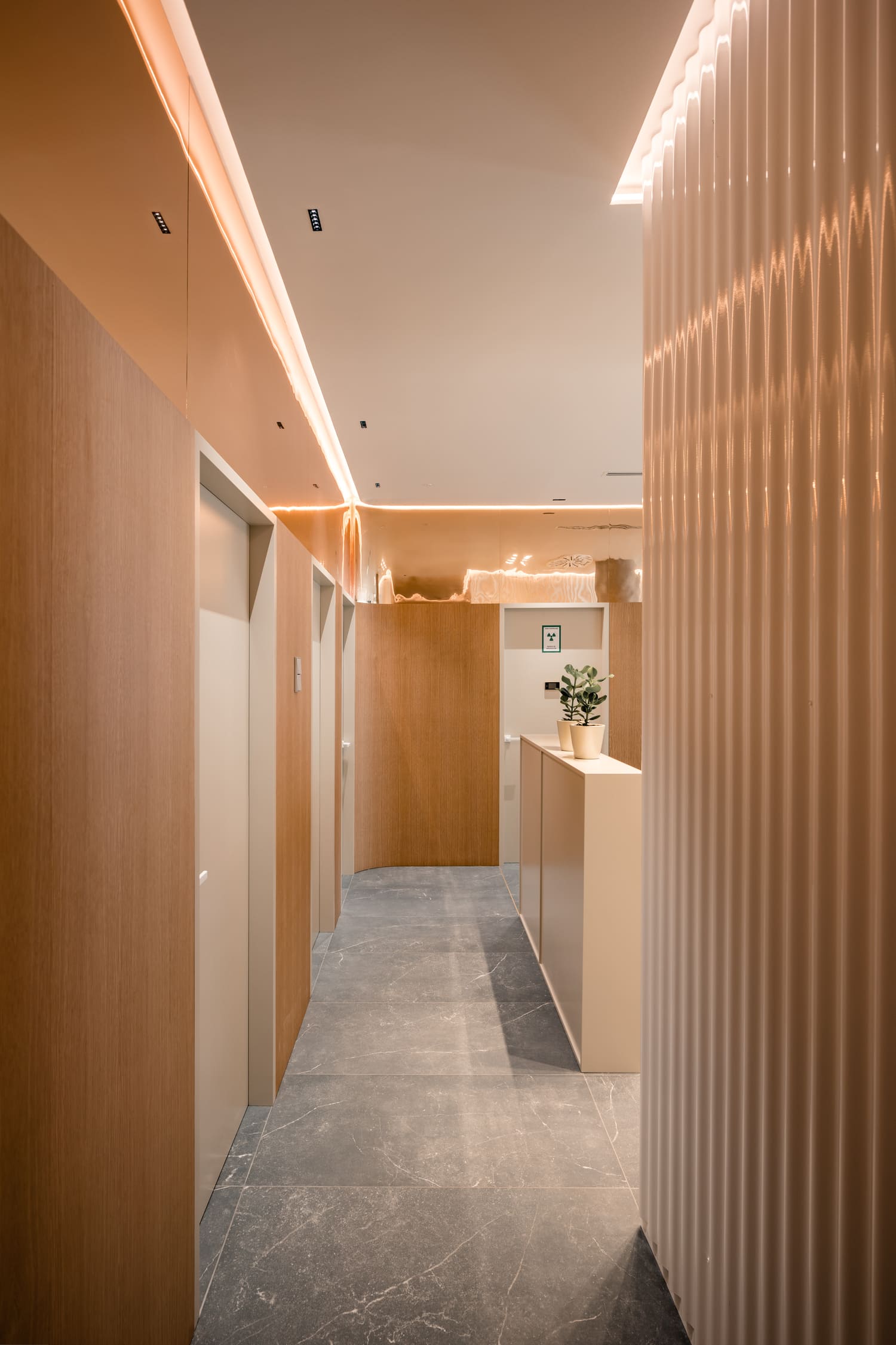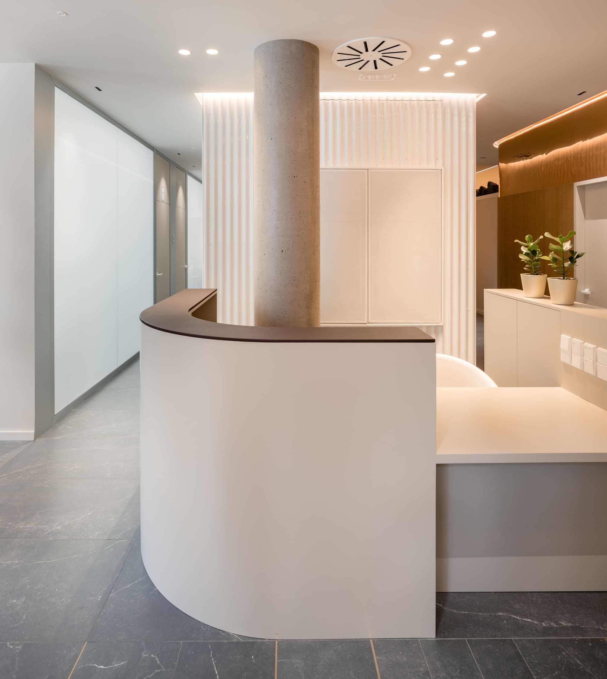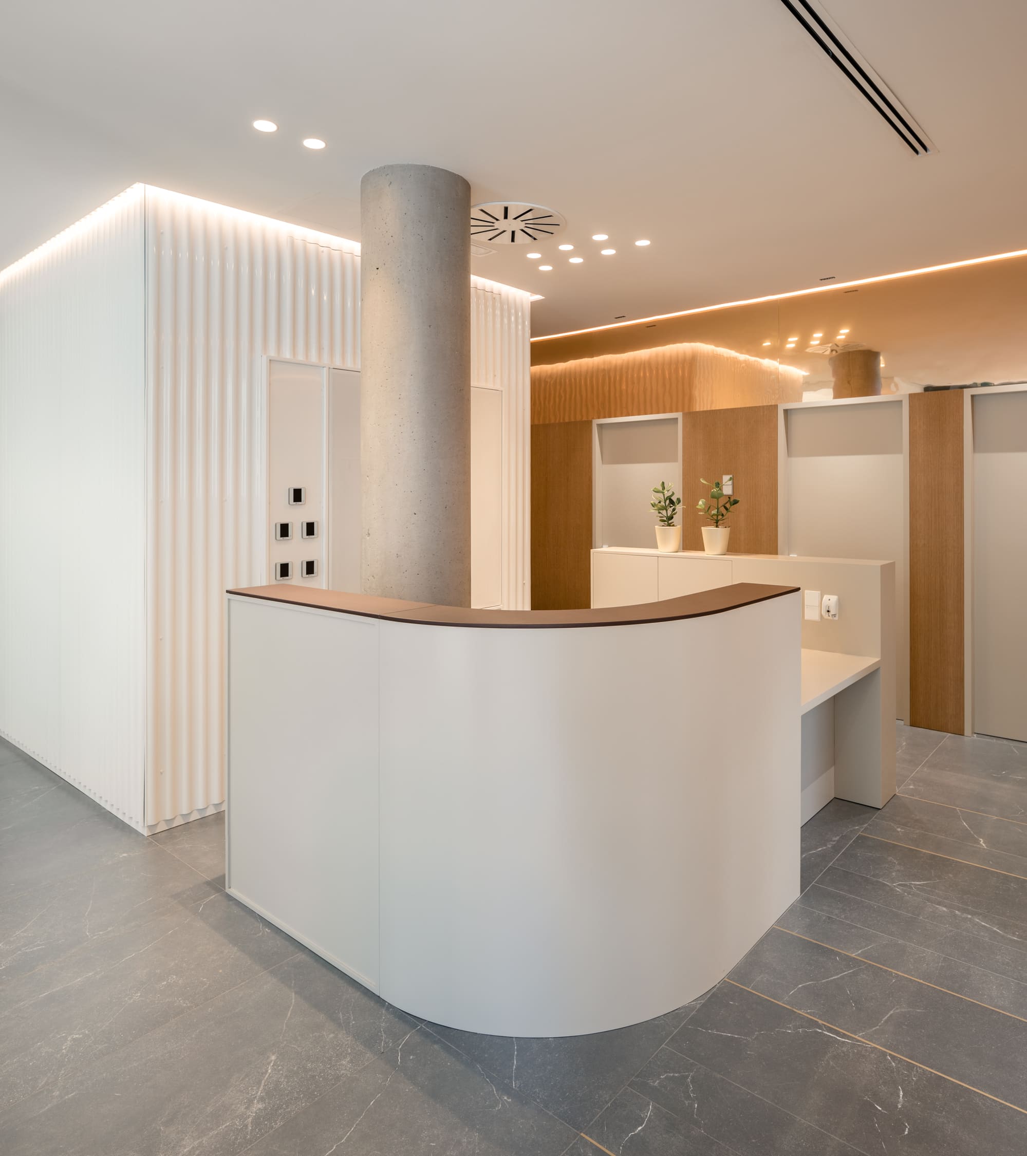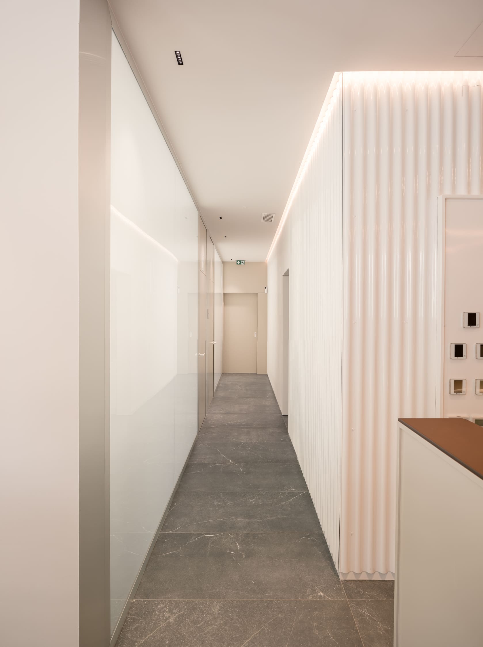 Con un programa extenso y muy detallado, empezamos a plantear los primeros bocetos de distribución que dibujaban circulaciones muy marcadas, zonas de estancia, zonas de trabajo y zonas de atención. Tratando de alejarnos estéticamente de una imagen de clínica convencional, la propuesta se centra en reflejos, en brillos, en texturas y en relieves, cada detalle nos forma una perspectiva diferente que nos permite alejarnos del carácter sanitario del local.