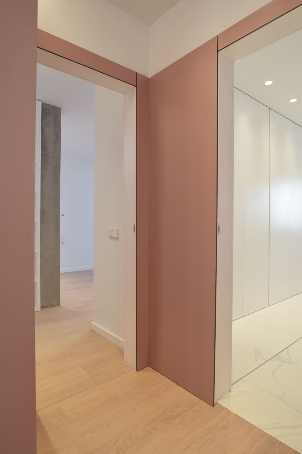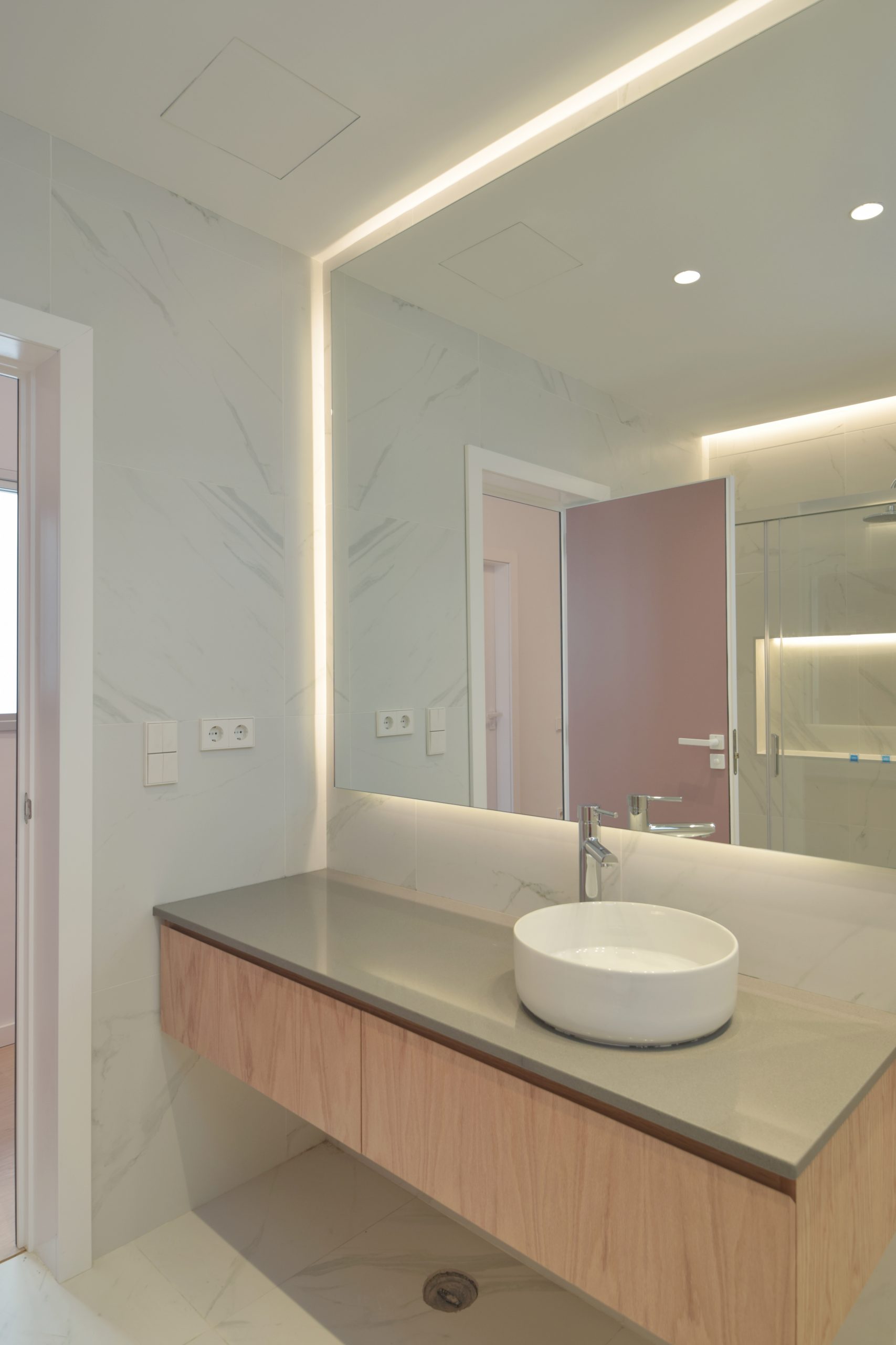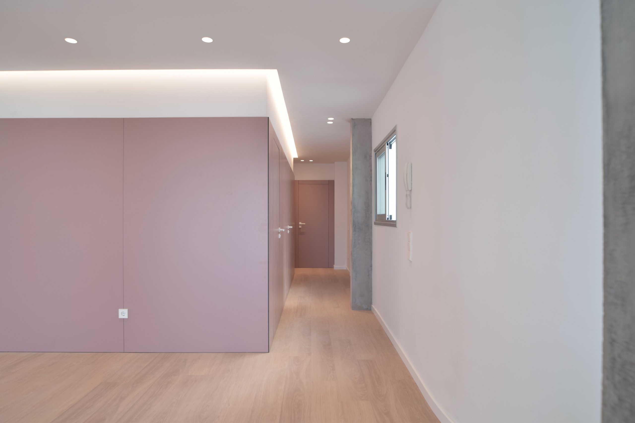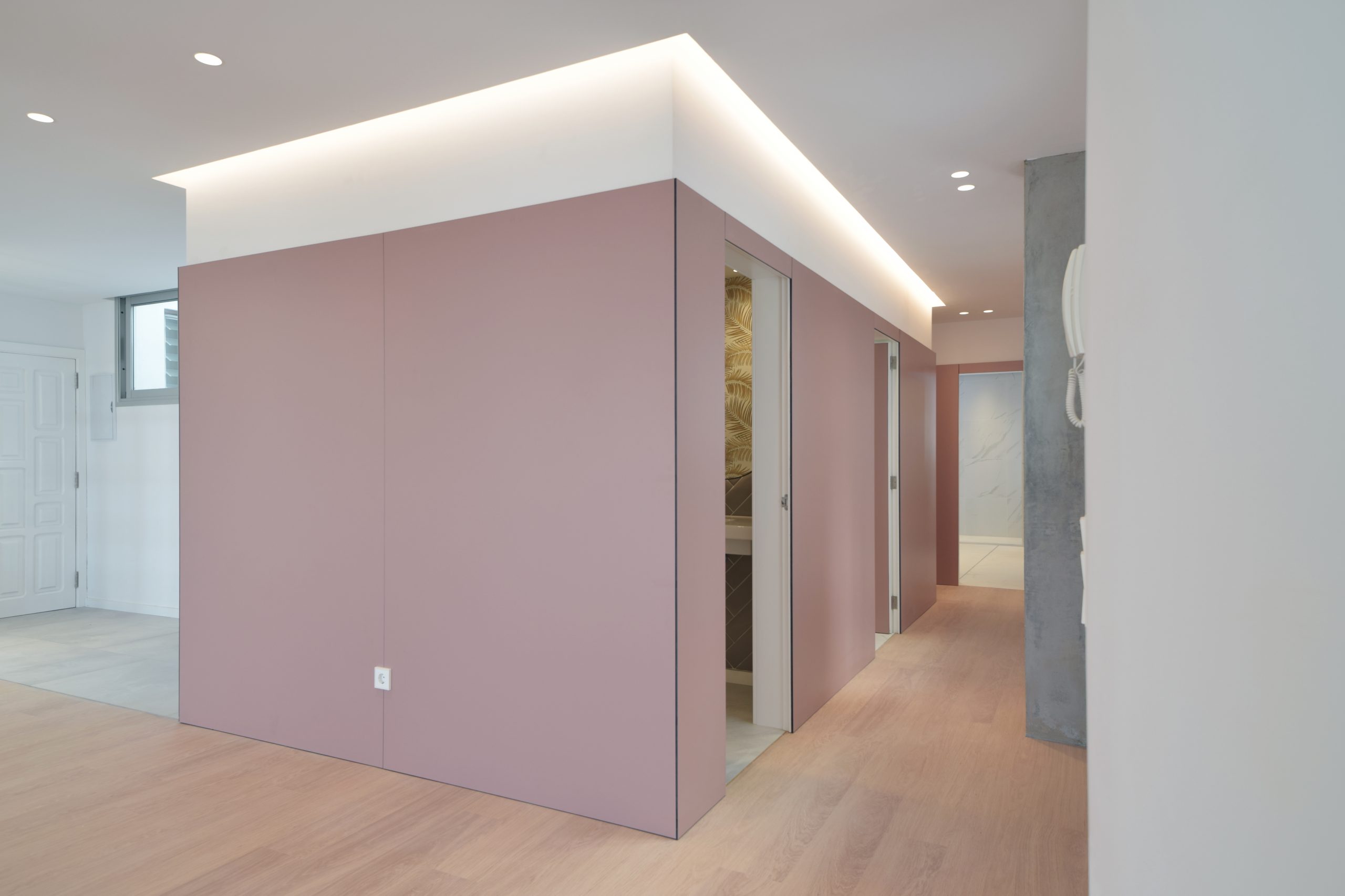 El punto de partida nos daba libertad completa para proponer diferentes opciones en base a varios criterios organizativos y finalmente se optó por maximizar el espacio principal, volcándolo hacia el espacio exterior que nos brindaba la vivienda y dotar de algo de carácter a la zona menos noble de la vivienda, revistiendo las paredes con un material disruptivo que rompiera con la amplitud del espacio y sus colores neutros.