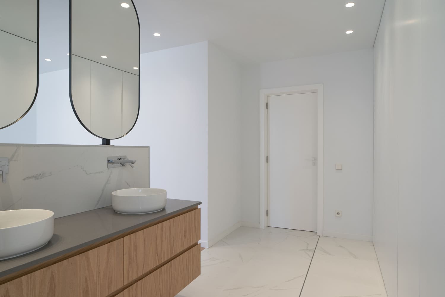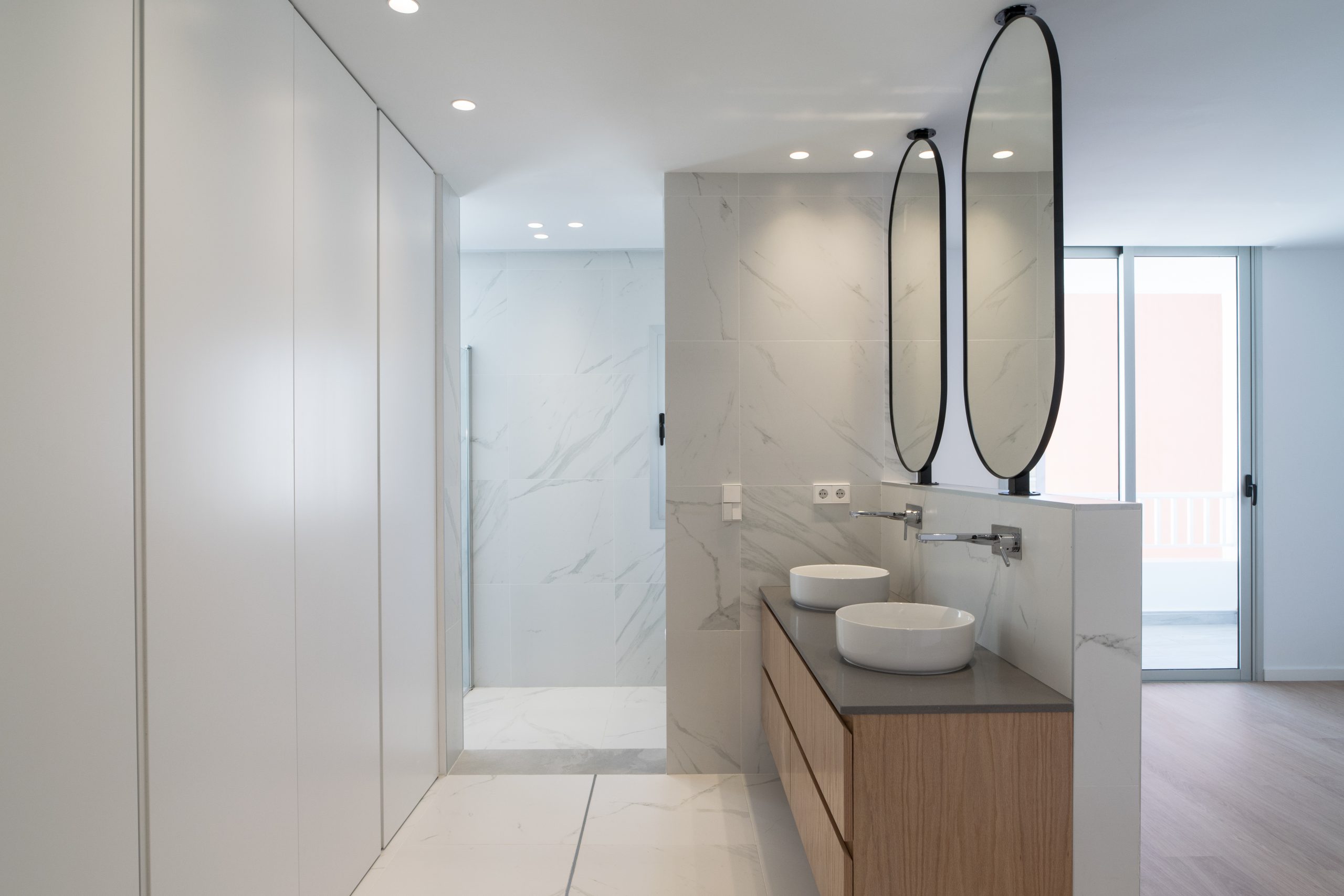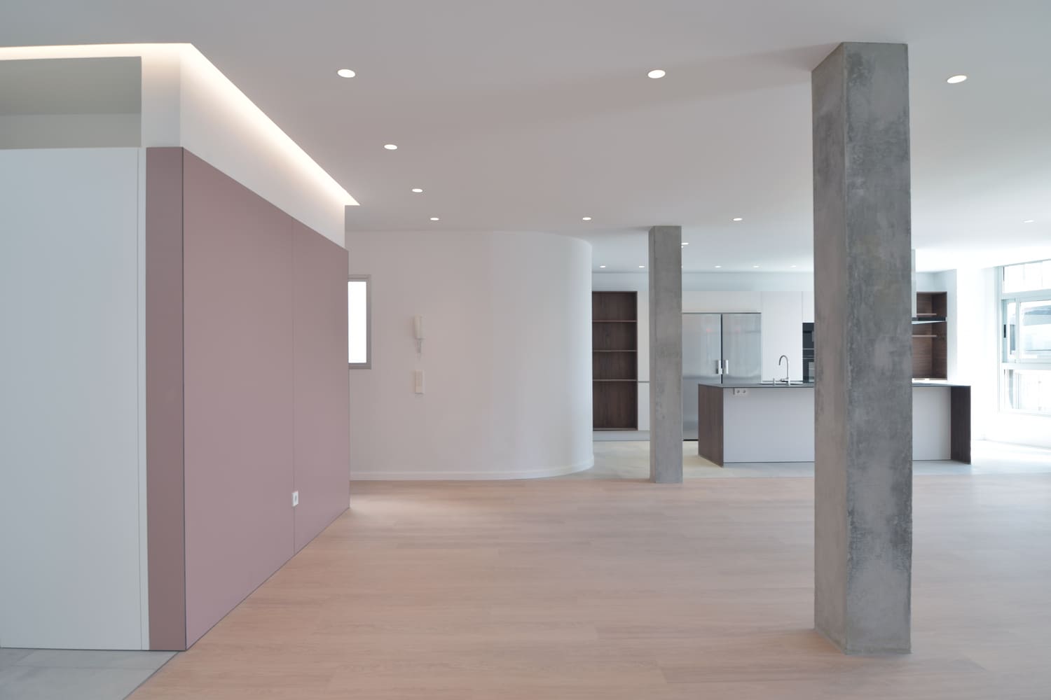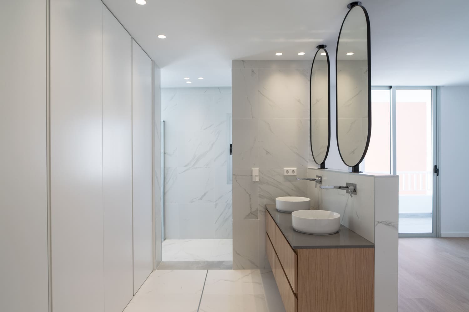 El punto de partida nos daba libertad completa para proponer diferentes opciones en base a varios criterios organizativos y finalmente se optó por maximizar el espacio principal, volcándolo hacia el espacio exterior que nos brindaba la vivienda y dotar de algo de carácter a la zona menos noble de la vivienda, revistiendo las paredes con un material disruptivo que rompiera con la amplitud del espacio y sus colores neutros.