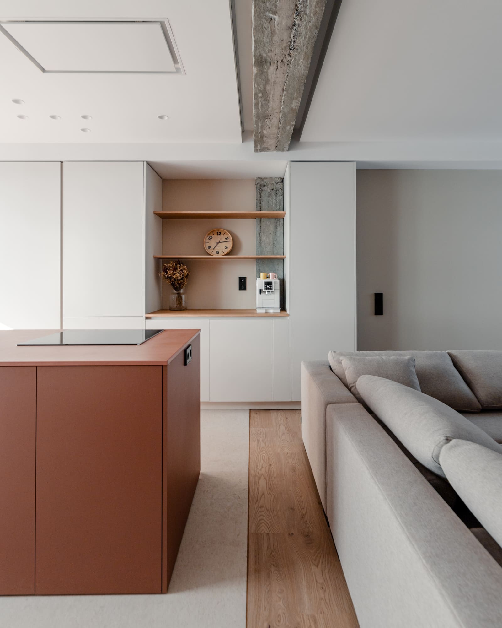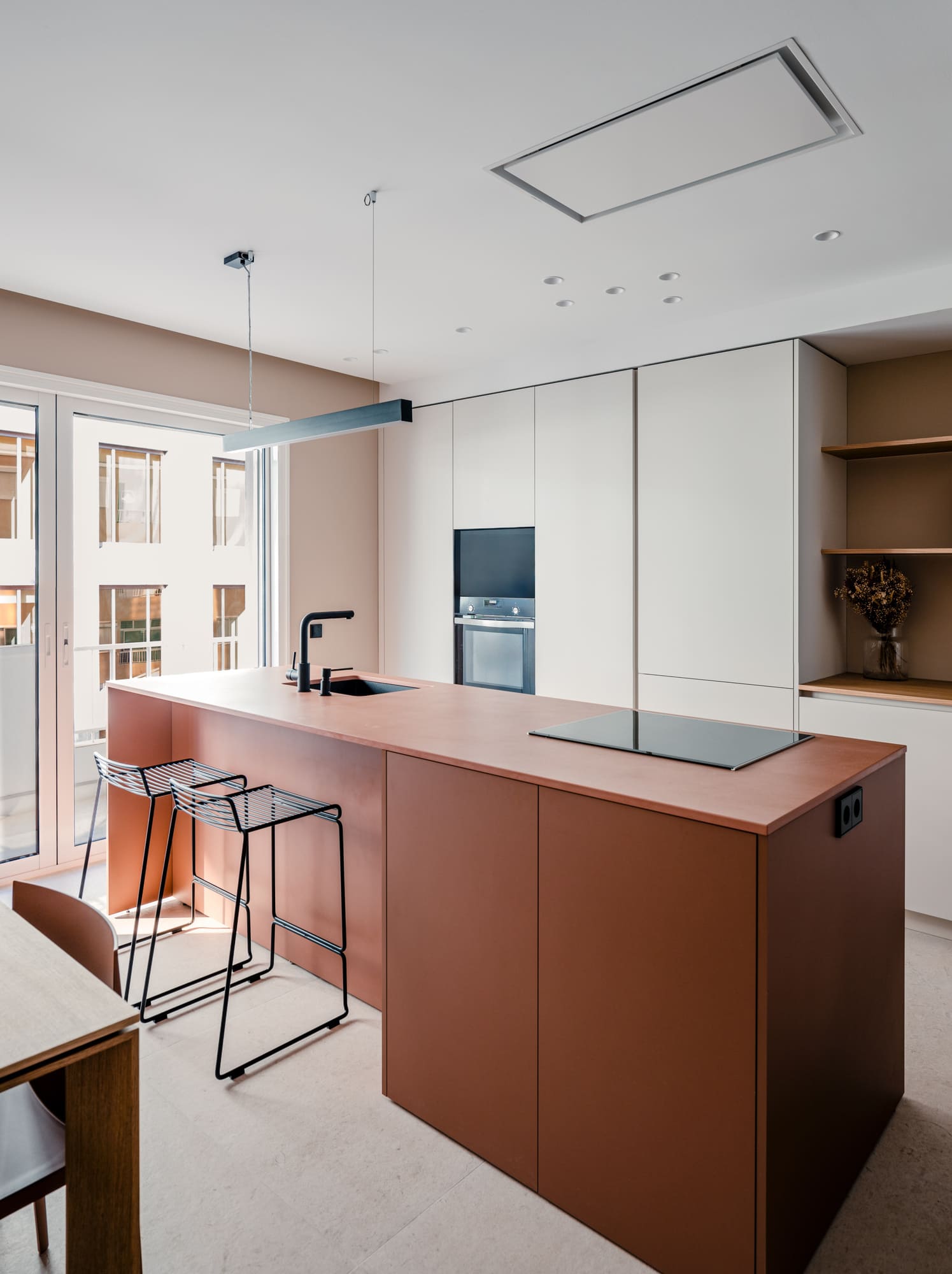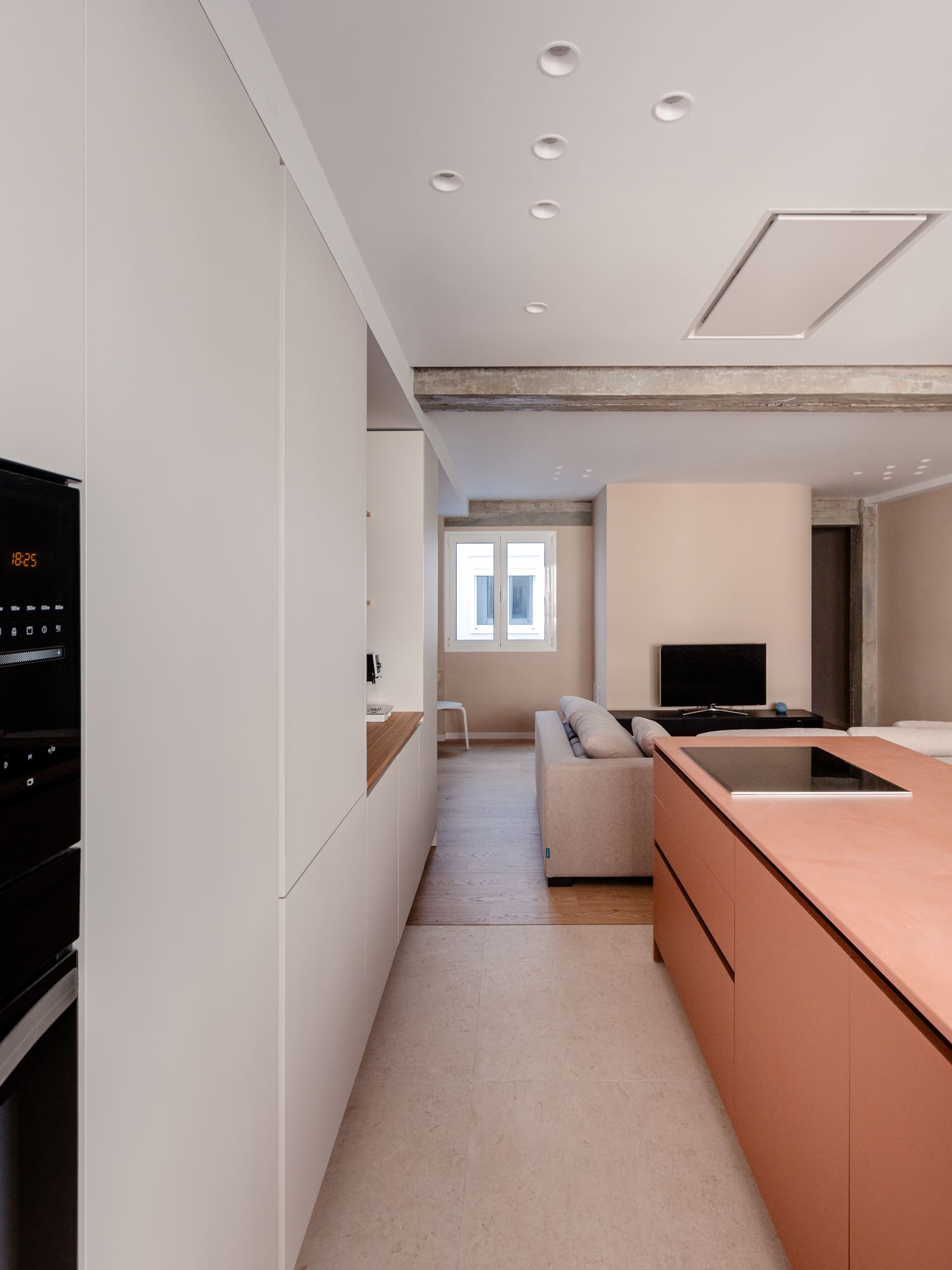 Nuestro trabajo consiste en girar el programa de la vivienda 180º y plantear una zona de vestíbulo como una parte funcional de la vivienda, colocando la solana y un aseo de cortesía y un espacio principal de salón comedor y cocina hacia el exterior, hacia la calle. Entre medio, los patios organizan las dos habitaciones y el resto del programa.