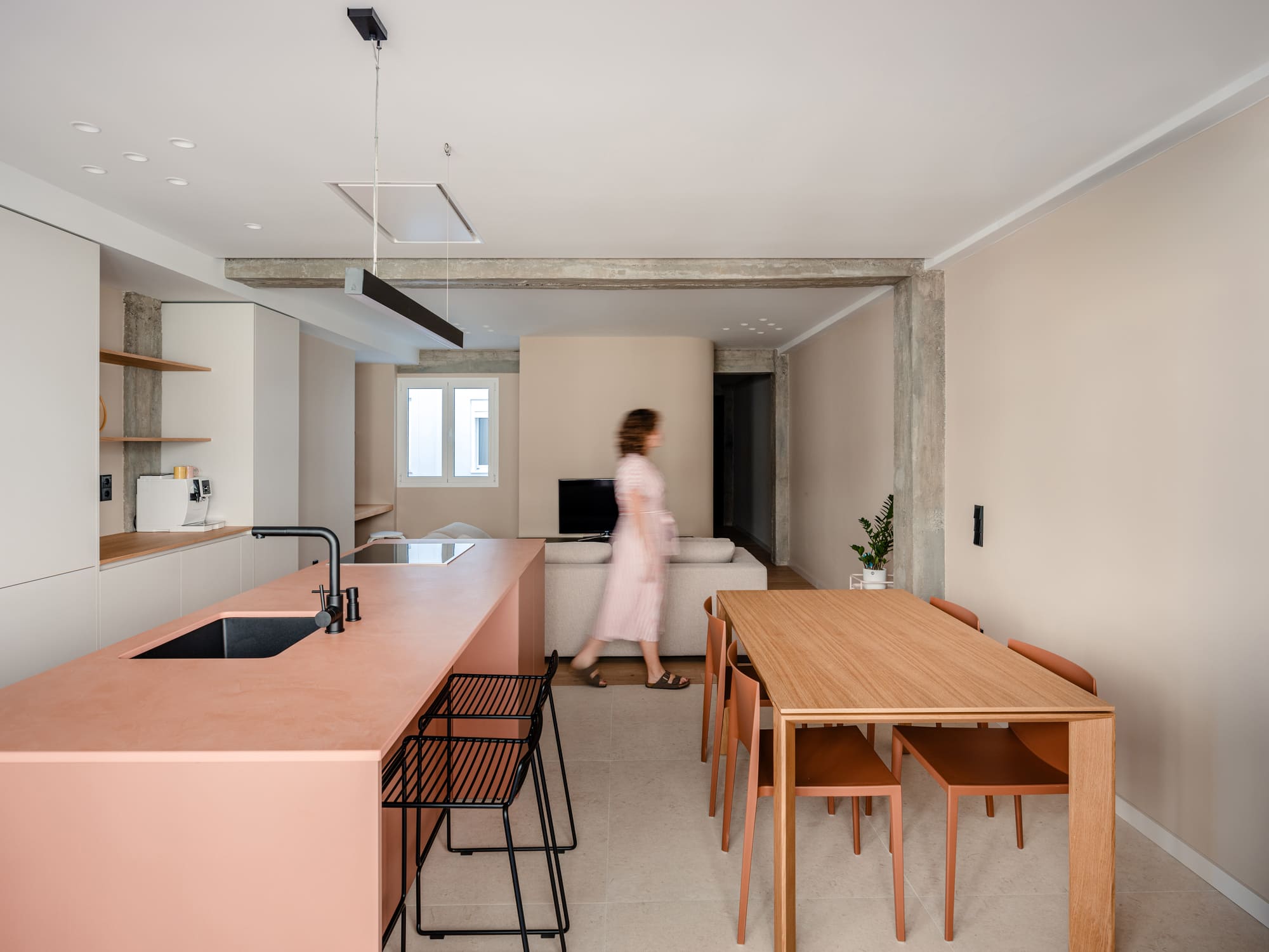 La vivienda es una pieza alargada a la que se entra por un extremo y que tiene una fachada a la calle principal en el lado opuesto. Entre medio, dos patios interiores amplios aportan luz y ventilación a los espacios.
