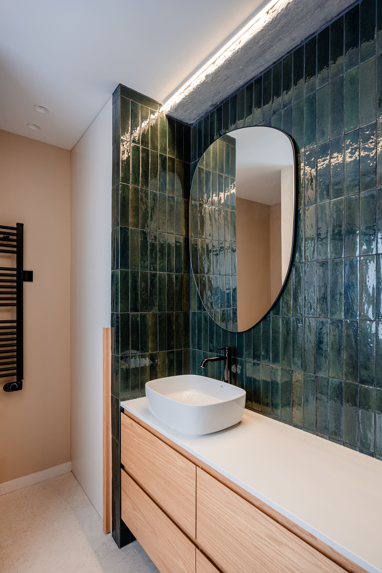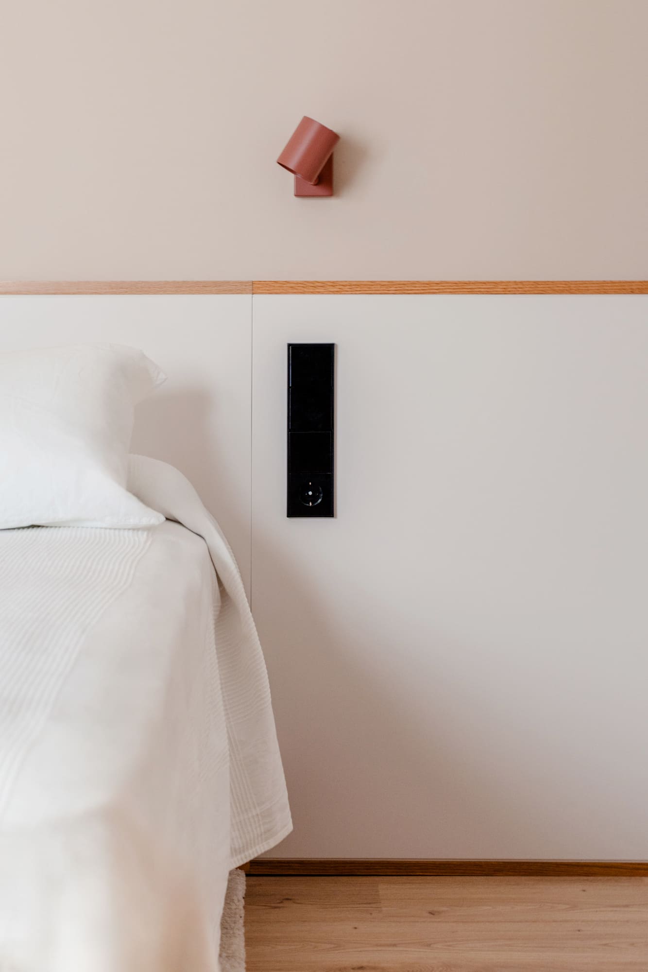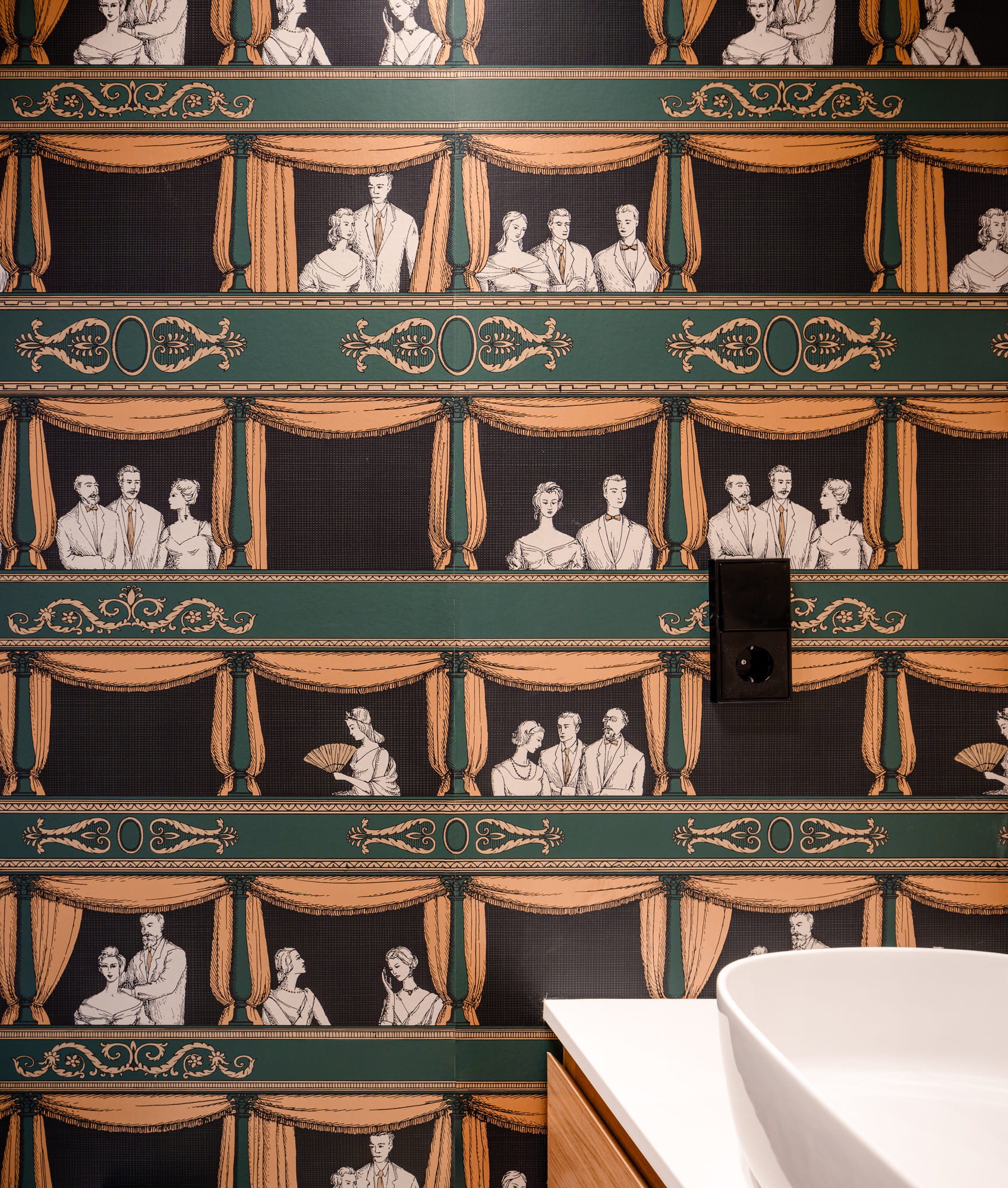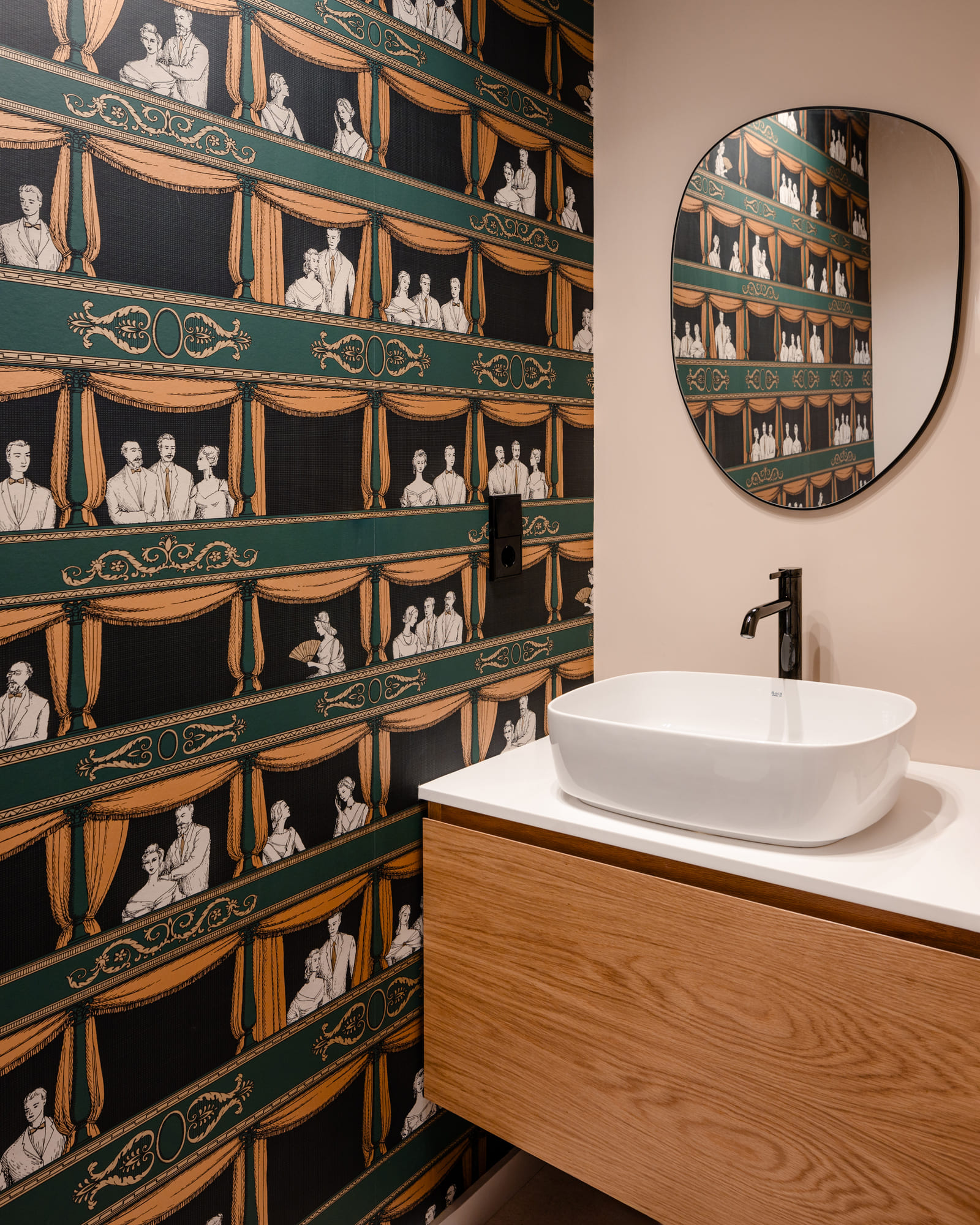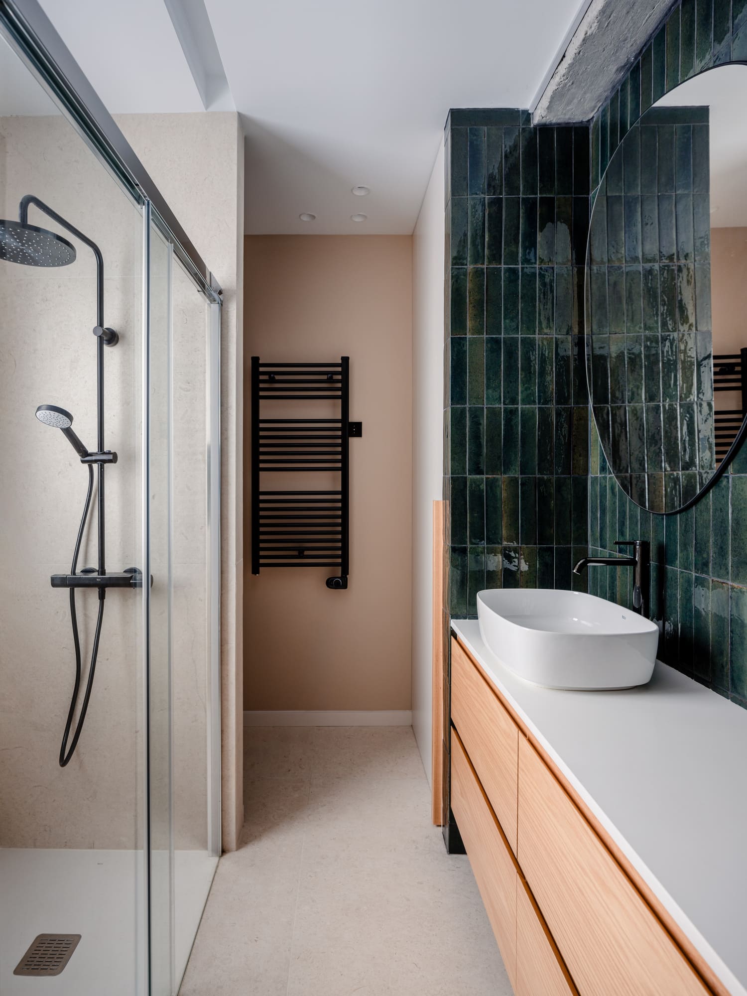 Materialmente se busca generar un ambiente amable, con el uso de maderas y colores terrosos. Por otra parte, se utilizan los espacios de baño para buscar la sorpresa y el contraste, con papeles y alicatados en verde.